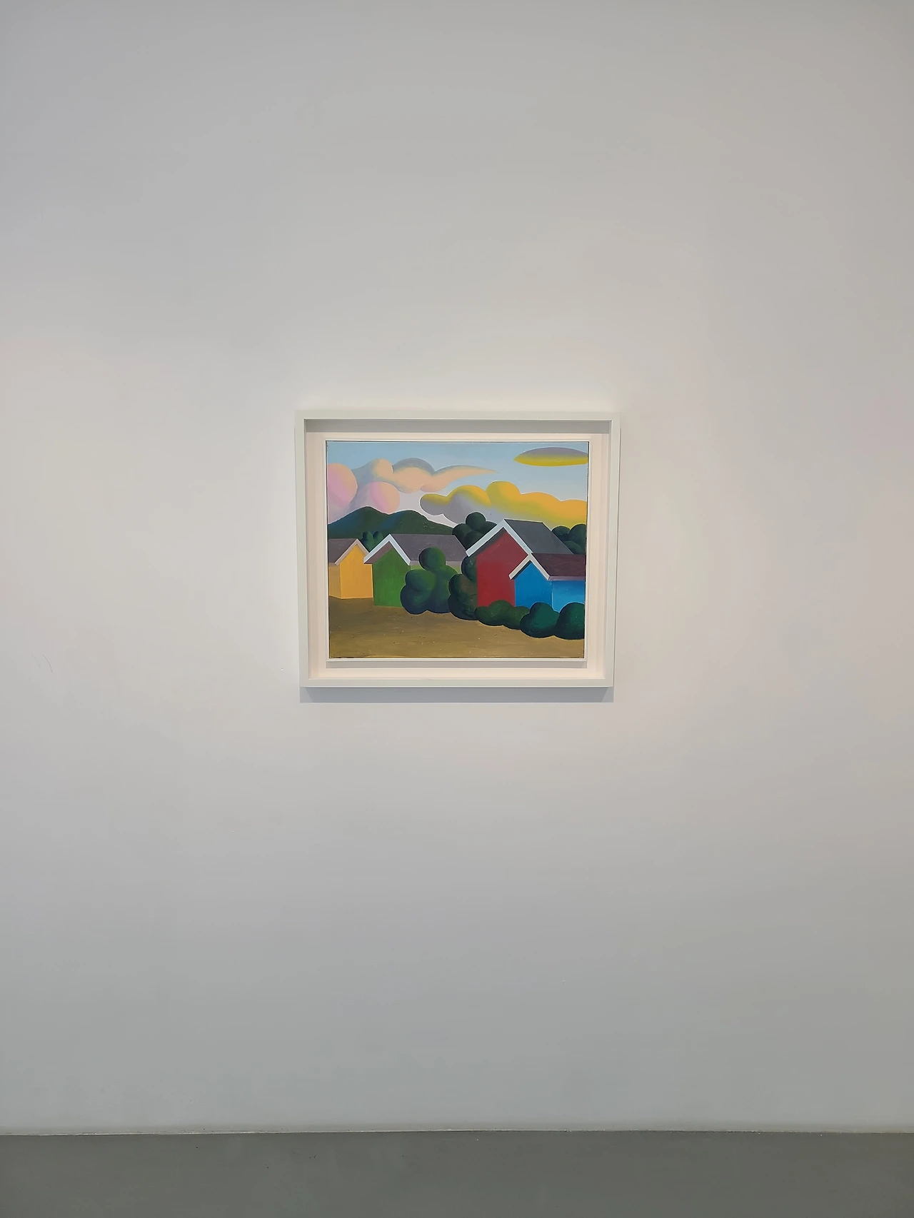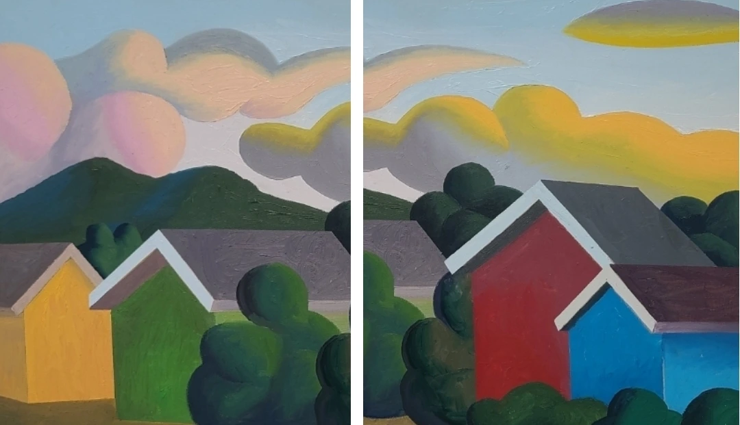 저의 얘기가 너무 길었네요. 작품에 대한 설명을 하겠습니다. 작가님의 풍경화은 단순히 현실을 재현하기보다는 상상의 공간을 다루고 있죠. 그래서 제가 봤을 때는 상상력이 풍부한 사람이라면 좋아할 법한 작품들이 참 많은데요. 이 작품에서 색감들을 보면 강렬하면서도 정말 조화롭게 표현되어 있습니다. 건물들의 선명한 원색과 뽀죡한 지붕의 반복은 리듬감과 생동감을 보여줍니다. 아마 작가님이 어떤 장소를 여행했을 때, 느꼈던 게 아닐까 싶은데요. 개인적으로 건물들의 대비되는 색으로 조화롭게 표현한 게 너무 인상 깊었습니다. 작품 속 소재들은 매우 단순한 형태로 그려져 있지만, 하늘은 주황색, 노란색, 분홍색 등 다양한 색이 섞인 구름으로 가득 차 있어 매우 비현실적이고 몽환적인 느낌을 주고 있어요. 이는 낮과 밤의 경계, 혹은 상상의 공간임을 암시하는 듯 보이며 작품의 독특한 분위기를 더하는 것이 포인트로 여겨집니다.