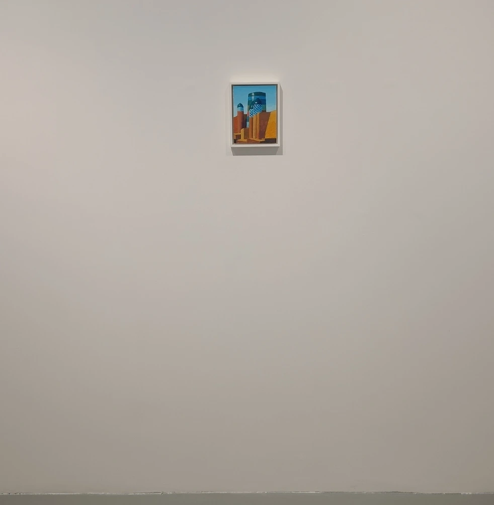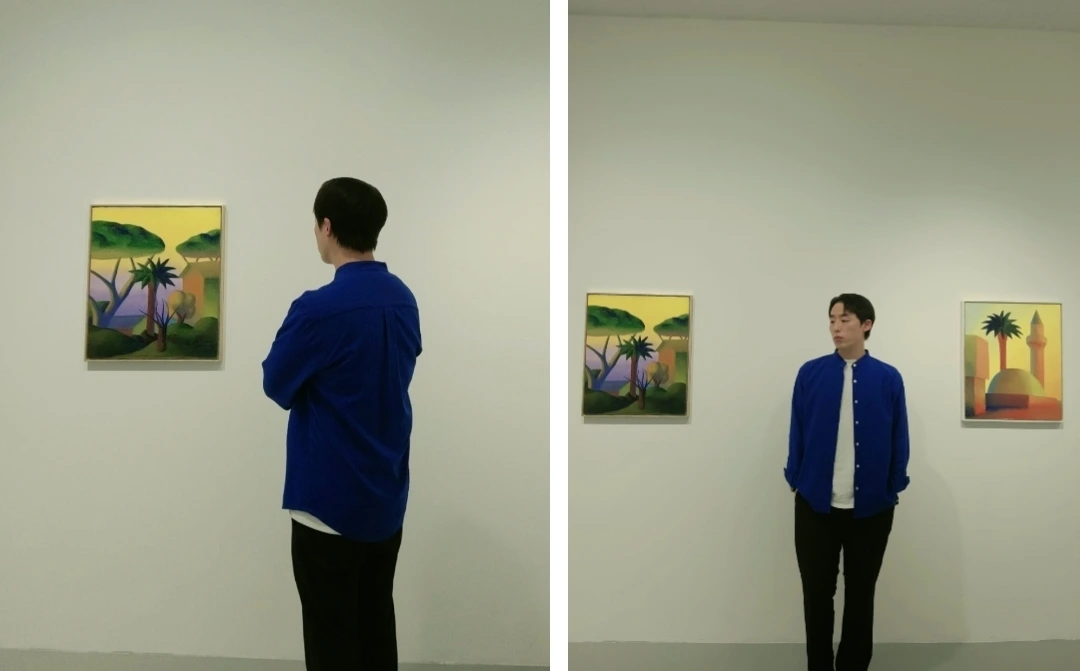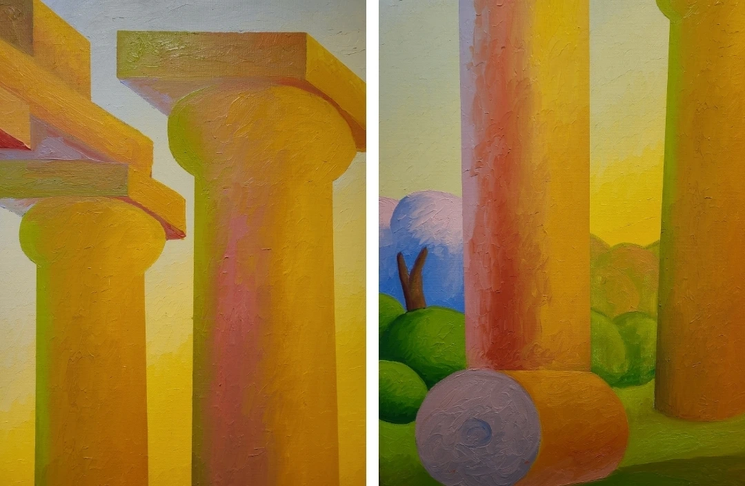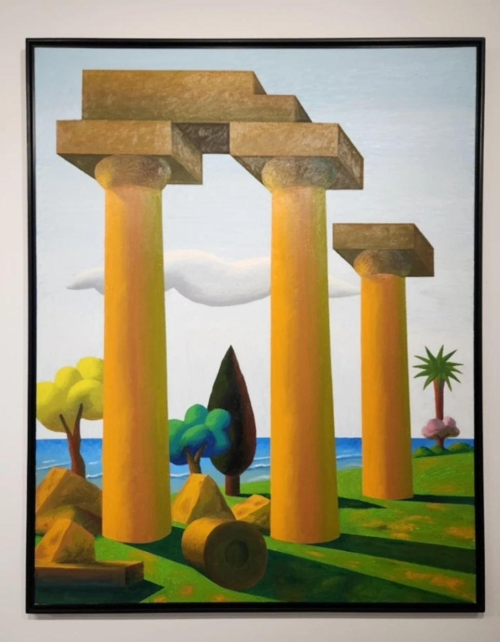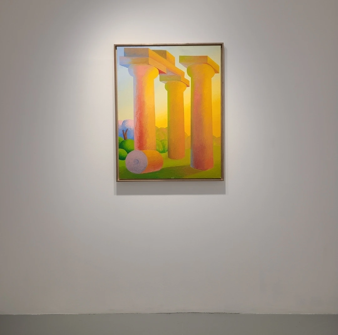 다음으로 소개할 작품은 이번 전시에서 대표작 중 하나로 뽑히는 <The Colonne>입니다. 전반적으로 채도가 높고 선명한 색감이 특징입니다. 세 개의 거대한 원통형 기둥과 하나의 쓰러진 기둥 파편이 화면 중앙에 배치되어 있습니다. 작품 속에 표현된 소재들이 다른 작품들에 비해 둥글게 표현된 게 인상적이죠. 노란색에서 주황색으로 이어지는 밝은 하늘이 햇빛이 아닌 기둥에서 자체적으로 빛이 나서 하늘에 영향을 준 듯한 느낌을 주고 있습니다. 그리고 하늘의 밝은 색과 녹색 계열의 배경이 기둥의 색과 대비되며 조화를 이루고 있어요. 특히 기둥을 보면 다른 작품들과는 달리 기하학적인 형태를 나타내고 있어서 세부 묘사가 보이지 않죠. 그래서 단순하고 명료한 표현들이 공간감이 확 드러난다기보다는 평면적인 느낌이 강하다는 생각이 들었어요.