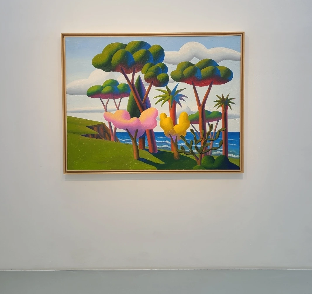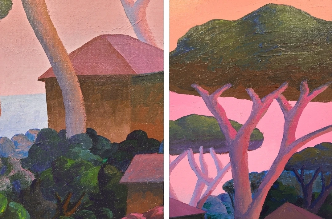 작품을 감상하면서 그림자가 참 독특하다는 생각을 했습니다. 사진에서는 구분하기 힘들지만, 자세히 보면 그림자가 단순히 검은색이나 회색이 아닙니다. 색상의 농도나 명암의 변화가 잘 표현되어 있죠. 사소한 디테일을 놓치지 않고 그린 점이 인상 깊었어요. 나무들의 형태도 알아볼 수는 있지만, 다소 비현실적인데요. 만화 속 캐릭터나 장난감처럼 묘사되어 있습니다. 나뭇잎도 덩어리로 표현된 게 구름과 어우러져 조화를 이루고 앞서 언급했듯이 색상에서 몽환적인 분위기를 연출함으로써 꿈속의 지중해를 느낄 수 있었어요.