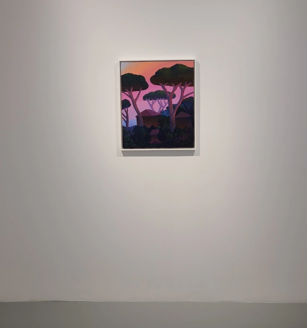 '개와 늑대의 시간'이라는 말은 프랑스어 표현으로, 해가 질 무렵 황혼을 의미합니다. 이 시간대는 어둠이 깔리기 시작하면서 멀리서 다가오는 실루엣이 내가 기르는 친숙한 '개'인지, 아니면 위협적인 '늑대'인지 분간하기 어려운, 경계가 모호하고 불확실한 때를 비유적으로 이릅니다. 사실 작가님이 가족들과 자주 갔던 휴양지를 묘사한 작품인데, 전혀 다르게 느껴져서 조심스럽긴 합니다. 그러나 작품에서 어두운 배경과 색채의 대비를 보면 일반적이 밝은 낮의 풍경과 전혀 다릅니다 그래서 묘한 긴장감과 신비로움이 더하죠. 멀리 보이는 건물들과 우산 모양의 소나무들조차도 이 어스름한 시간 속에서 실루엣처럼 아련하게 느껴지며, 그 정체를 완벽히 파악하기에는 다소 어려워 보였어요. 아무래도 작품 사이즈가 작은 것도 한몫을 한 거 같습니다. 그래서 색채들이 낮과 밤의 경계를 흐릿하게 만드는 것처럼 '개와 늑대의 시간'이라는 표현이 생각났습니다.