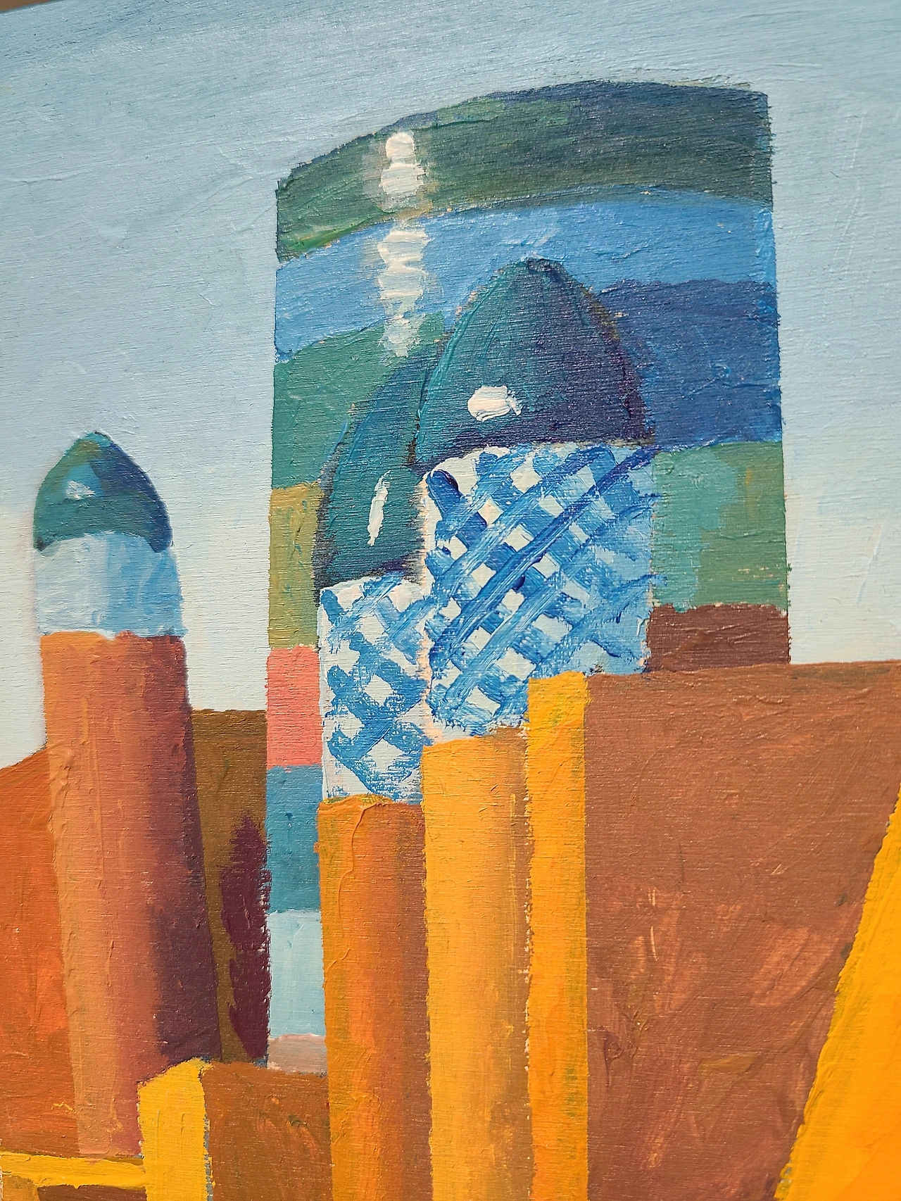 작품을 보면 하늘을 표현한 밝은 파란색과 건축물의 주황색과 갈색의 대비가 매우 두드러지고 청록색과 푸른색 계열의 패턴으로 건축물을 표현한 게 인상 깊은데요. 특히 중앙아시아의 강렬한 햇살 아래 건축물이 빛나는 듯한 느낌을 주지만, 동시에 그림자나 빛의 미묘한 변화를 통해 시간의 흐름이나 정적인 분위기를 나타냅니다. 이러한 정적인 분위기는 건물의 웅장함과 견고함을 보여주는 듯 느껴졌어요. 다른 작품들에 비해 원근법보다는 평면적인 구성이 돋보이는데요. 공간감보다는 상징적인 분위기를 전달하려는 의도가 느껴집니다. 가보지 못한 장소에 대한 동경과 염원이 이렇게 표현되는구나 싶었어요.