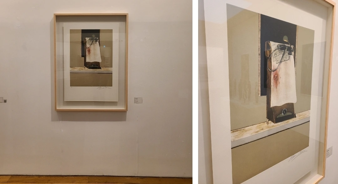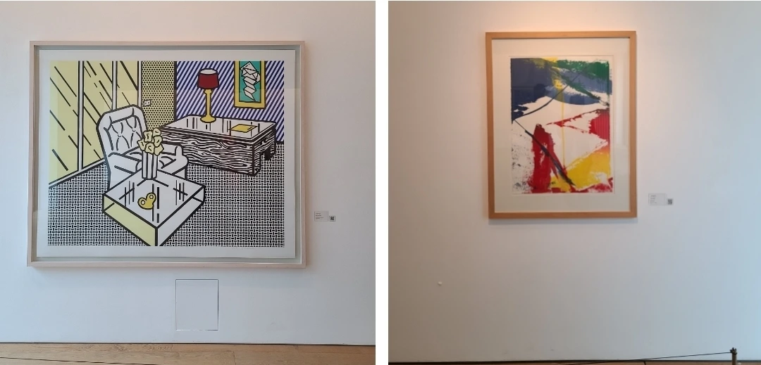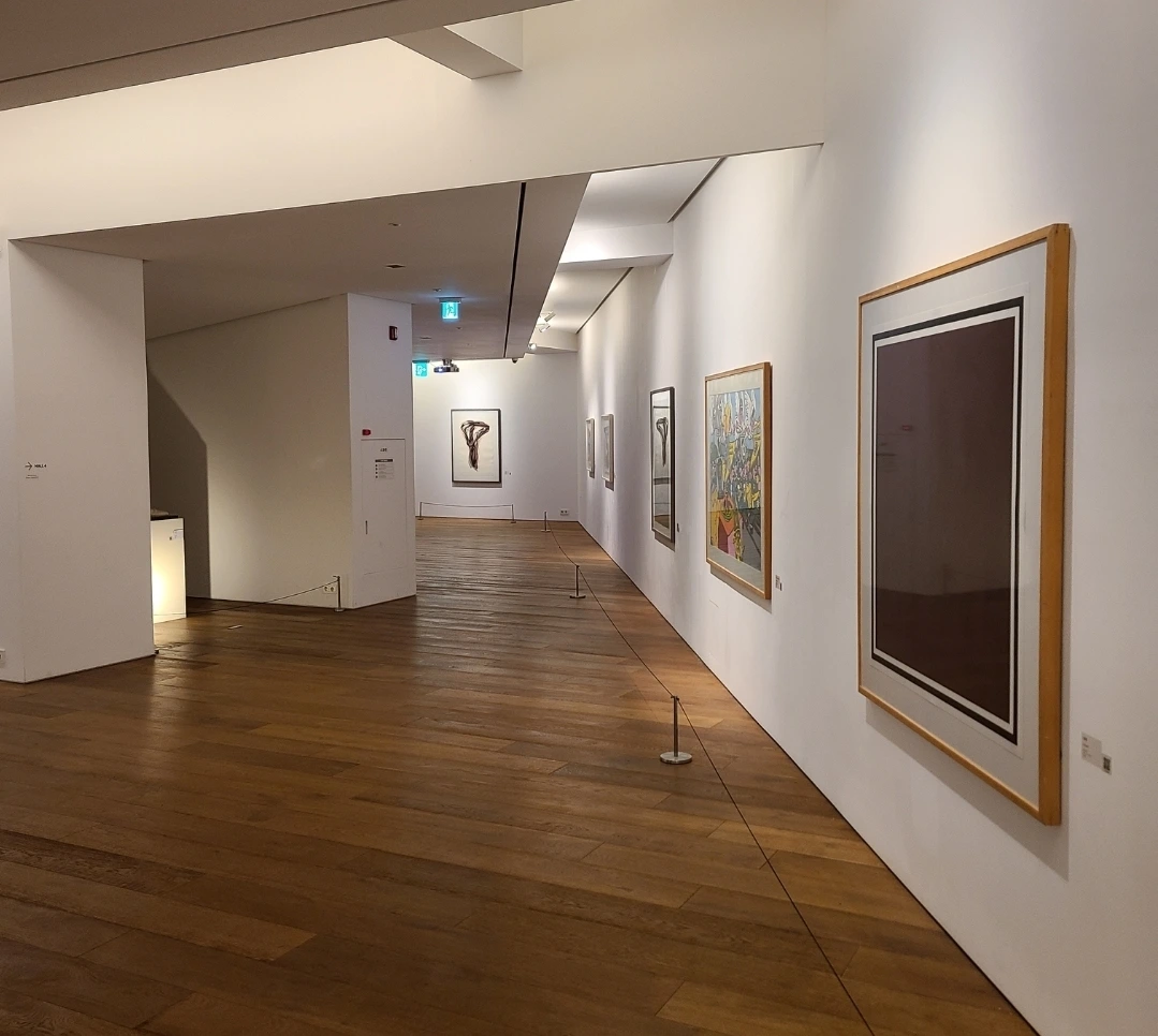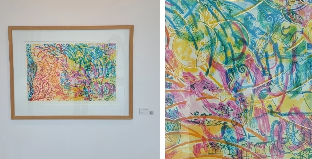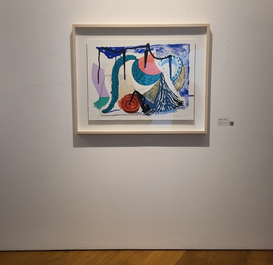작품의 의미를 생각하고 찾아내는 건 다소 난해했지만, 아쿼틴트 판화기법으로 제작되었다는 점이 흥미로웠습니다. 아쿼틴트는 다양한 색상과 질감을 표현하고, 여러 겹의 레이어를 중첩시키기에 적합한 기법이죠. 작품에서 보이는 복잡한 선과 색채의 겹침은 이러한 기법적 특성이 잘 나타나 있었습니다.