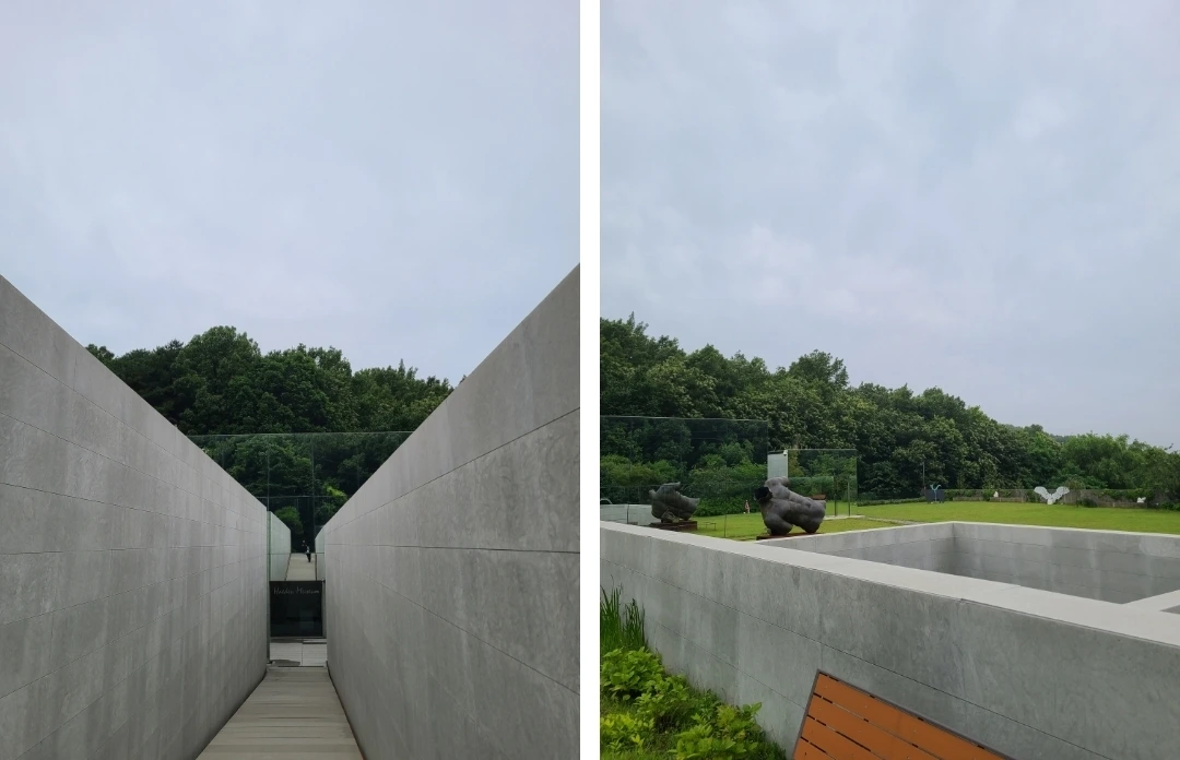 전시 감상에 앞서 '해든뮤지움'에 대해 소개를 하자면, 2013년 5월 11일에 개관하여 강화도에는 유일무이하게 있는 미술관입니다. 미술관은 배다용 건축가님이 설계한 곳으로써 2013년도 올해의 건축 베스트 7에 선정된 곳이기도 하죠. 산 중턱에 위치하고 있어서 미술관 주위를 보면 산에 둘러싸여 자연경관과 잘 어우러지는 듯한 느낌을 받아요. 서해바다를 연상시키는 강화도에 또 다른 이미지를 저에게 심어주었죠. 넓은 정원에 있는 조형작품들도 좋았지만, 콘크리트 입구와 거울을 이용한 설계가 상당히 엣지있고 인상 깊었습니다.