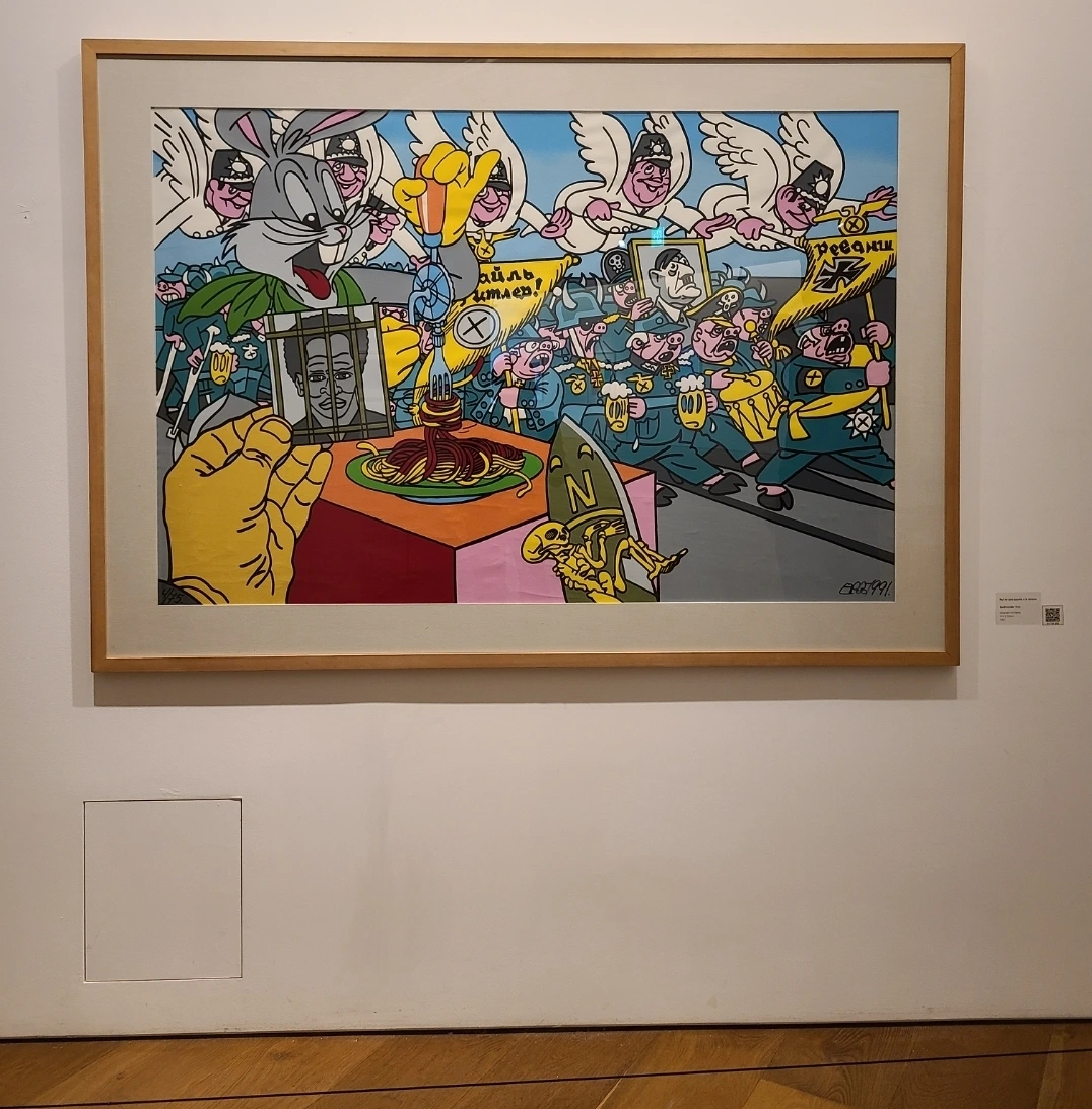 작품 위에서부터 캐릭터들의 의미를 찾아보자면, 벅스 버니와 군인 모자를 쓴 천사들이 우르르 몰려옵니다. 순수하고 대중적인 캐릭터와 종교적인 상징인 천사 그리고 군사적인 요소가 섞여있죠. 대중문화와 폭력, 그리고 위선적인 권력을 끄집어냈습니다. 그래서 제가 보기에는 양의 탈을 쓴 늑대(?) 혹은 '천사의 모습이지만 폭력이 숨어있는 건가?' 하는 느낌을 받았습니다. 그리고 왼쪽 아래에는 창살에 갇힌 인물과 스파게티가 보입니다. 자유가 박탈당했는데 웬 스파게티가 앞에 있는 거 보면 너무 아이러니하죠. 누군가는 고문과 억압을 받지만, 평범하거나 혹은 풍요로움을 느끼면서 살고 있는 우리 인간의 모순과 억압된 현실을 잘 나타내고 있어요. 그리고 총칼 든 무리들이 보이는데, 제2차 세계대전의 주범인 히틀러 사진을 들고 행진하고 있습니다. 그냥 대놓고 광기 어린 모습으로 인간의 존엄성을 짓밟는 폭력을 상징하고 있는 것처럼 보였어요.