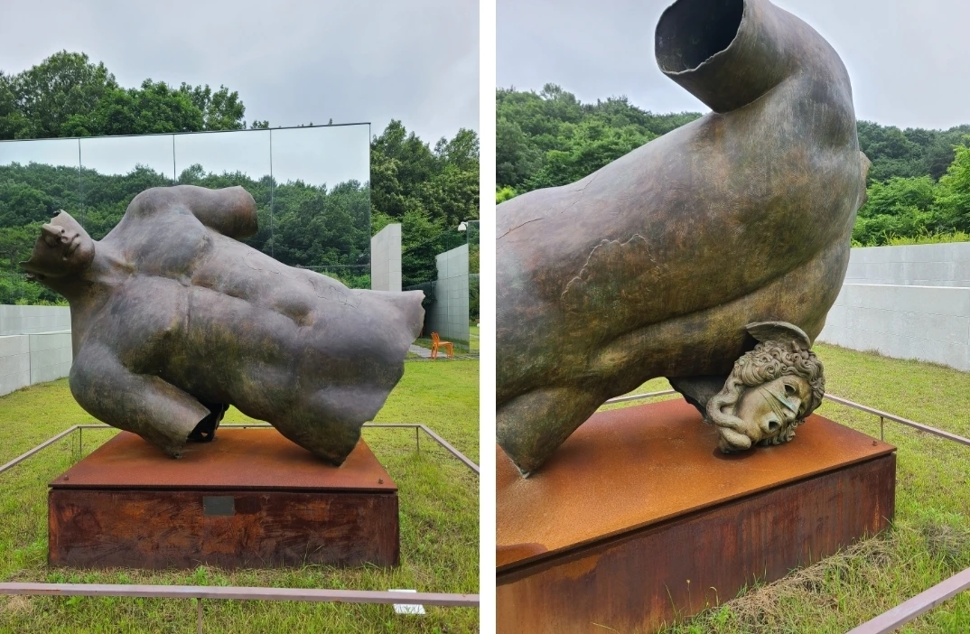 이 작품은 특히 고전과 현대가 매우 조화롭게 표현이 되었다고 보이는데요. 예를 들면, 매끄러운 곡선과 근육의 표현은 고전적인 미학을 따르지만, 손상되고 불완전한 모습은 현대적인 감각을 따르고 있어서 시대를 초월하는 매력을 가진 작품이라고 평가를 받고 있습니다. 작품을 보면서 '왜 신은 인간을 욕망덩어리로 만들어 우리에게 이러한 고통을 줄까...' 하는 생각을 했는데, 이런 생각을 하는 제가 덧없다고 느꼈습니다. <이카루스의 토르소(Torso di Ikaro)> 는 현재 해든뮤지움의 야외공간에 설치가 되어있어요. 그래서 거울로 마감된 건물 외벽에 비치면서 자연경관과 어우러지는 모습이 너무 인상적이었습니다.