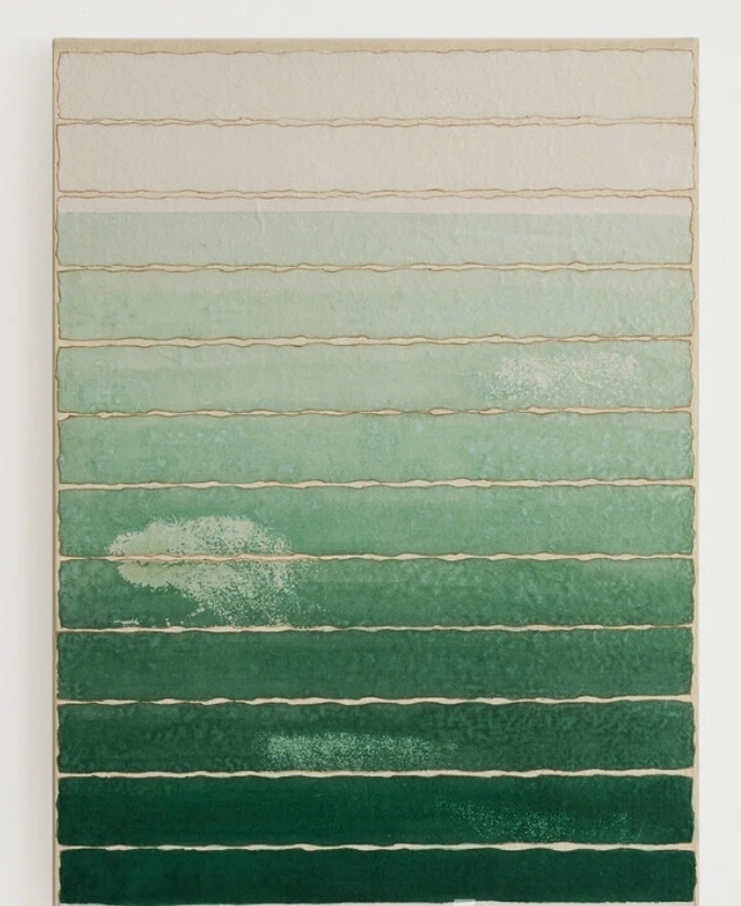 그리고 초록색으로 표현된 작품은 울창한 숲 속 같다는 느낌을 받는 반면에 한 장의 초록색 식물 잎으로도 보입니다. 그래서 하나의 생명의 탄생 혹은 서서히 수풀림이 만들어지는 과정을 연상하게 만듭니다. 전반적으로 작가가 추구하는 색의 깊이, 색을 통한 공간감 그리고 나누어진 선들이 핵심요소로 드러나고 그라데이션의 향연을 제대로 만끽할 수 있습니다.