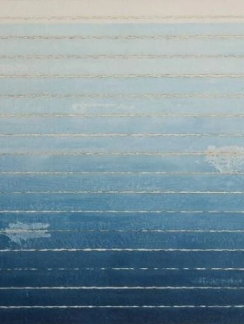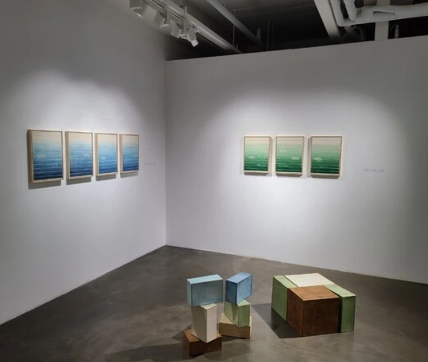 갤러리에 들어서면, 본 전시의 제목이자 대표작인 <Flow>의 작품을 볼 수 있었습니다. 작품은 파란색과 초록색의 하나의 색깔로 수평선처럼 표현되었습니다. 우선 파란색으로 표현된 작품을 실제로 보면, 하늘과 바다를 한 화면에 담은 것처럼 보이기도 하고 파도의 물결이나 거품처럼 보였습니다. 특히 한 단계씩 파란색의 깊이를 더해가는 그라데이션은 밝고 시원한 느낌을 받았습니다.