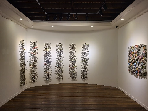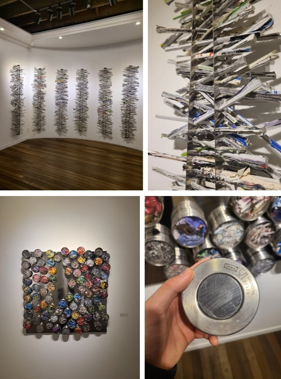 다음으로 두 개의 작품을 한꺼번에 소개할 까 합니다. 바로 <What's now I>와 <Somewhere before 250806>입니다. 이 작품들은 다른 작품들과는 달리 작품들을 만들고 남은 부분들로 스테인리스와 함께 제작한 작품인데요. 작품들을 보면서 재활용을 넘어서 업사이클링(Upcycling)의 극한을 보여주는 게 아닌가 하는 생각이 들었습니다. 전반적으로 작가님의 작품은 버려진 잡지나 인쇄물로 만들어졌는데, 거기에서 또 버려진 쓰레기로 작품을 만들었으니 너무 놀라웠는데요. 작품의도는 모르겠으나, 적어도 작가님이 환경윤리를 생각하는 마음은 확실히 느꼈습니다.