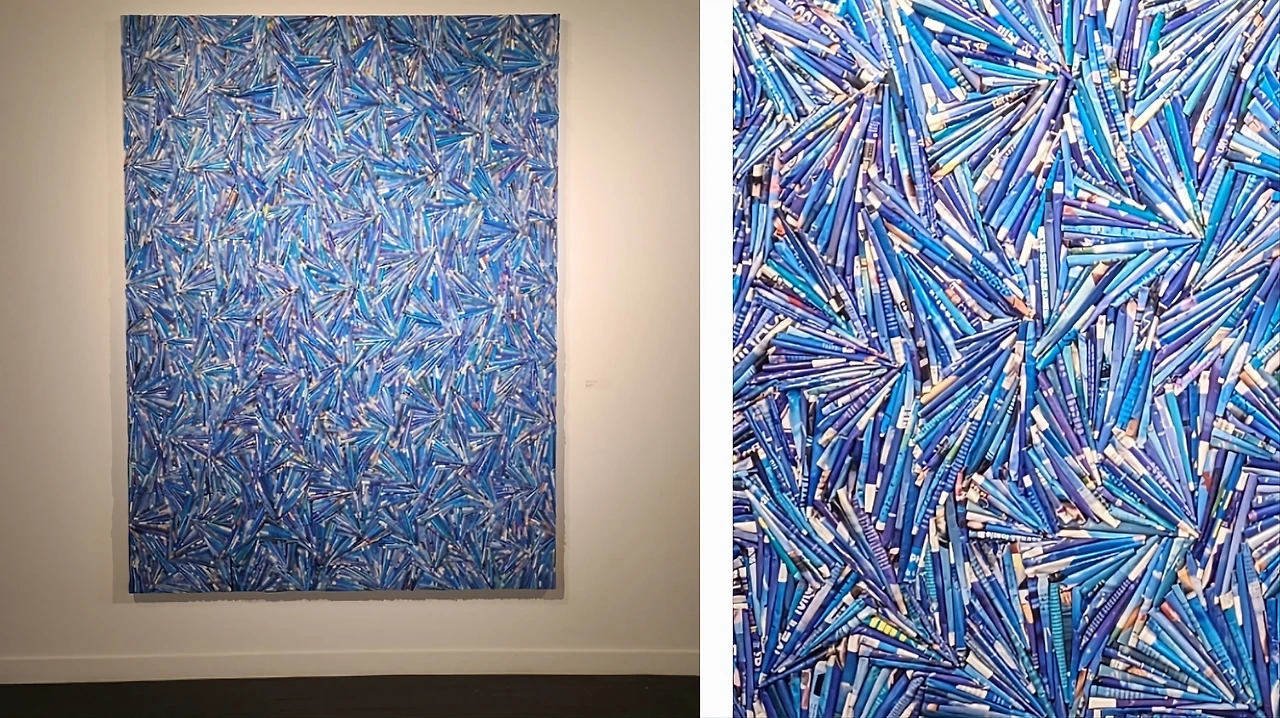 특히 작품의 색감은 제목과 연관해서 봤을 때 파도의 단면을 자른 바다의 심해를 연상하게 만들었죠. 사실 작가님이 왜 푸른색계열을 사용했는지에 대한 이유는 알 수 없지만, 시끄러운 정보의 파편들이 깊은 물속에서 정화되어 고요함과 응축된 에너지를 관객들에게 선사하는 듯 보였습니다. 읽고 버려진 쓰레기에서 깊은 바다를 느꼈다는 게 신기했고 계절을 생각해 보면, 여름보다는 겨울바다가 좀 더 가깝지 않을까 하는 것도 머릿속에 떠올랐습니다. 결론적으로 이 작품은 결국 소비되고 사라지는 시대의 잔해를 작가님의 손에서 숨겨진 시간과 물성의 깊이를 탐색하는 작품이었습니다.