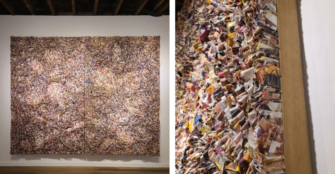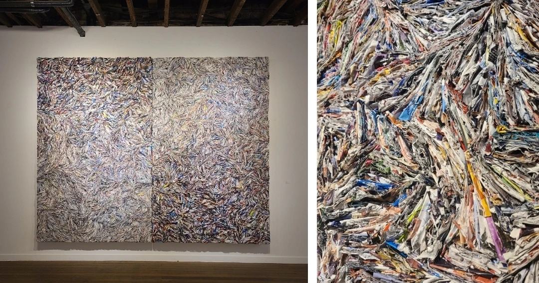 이번 전시에서 가장 색이 많고 다채로운 작품을 하나 소개할게요. 형형색색의 종이들을 구기고 접은 방식으로 만들어진 작품 제목은 <What's new II 250902>입니다. 이 작품은 작가님께서 파리에서 체류하는 동안 만들어진 작품인데요. 포인트는 바로 패션 매거진 표지를 주재료로 제작되었다는 점입니다. 이전 작품들과는 다른 차별성을 띄는데요. 특히 빨강, 노랑, 분홍, 파랑 등 채도 높은 원색들을 사용함으로써 시각적으로 강렬하고 자극적인 느낌을 줍니다. 뭐랄까... 저는 이것을 '유행의 카오스'라고 표현하고 싶은데요. 예를 들면, 사람들의 이목을 끌기 위해 자극적인 요소들을 사용합니다. 이 요소들이 강렬한 원색이라고 하면 질서 없는 패턴들은 요즘 쏟아져 나오는 SNS 광고들의 패턴이라고 볼 수 있죠. 적나라하게 잘 보여주는 작품이라고 여겨집니다.