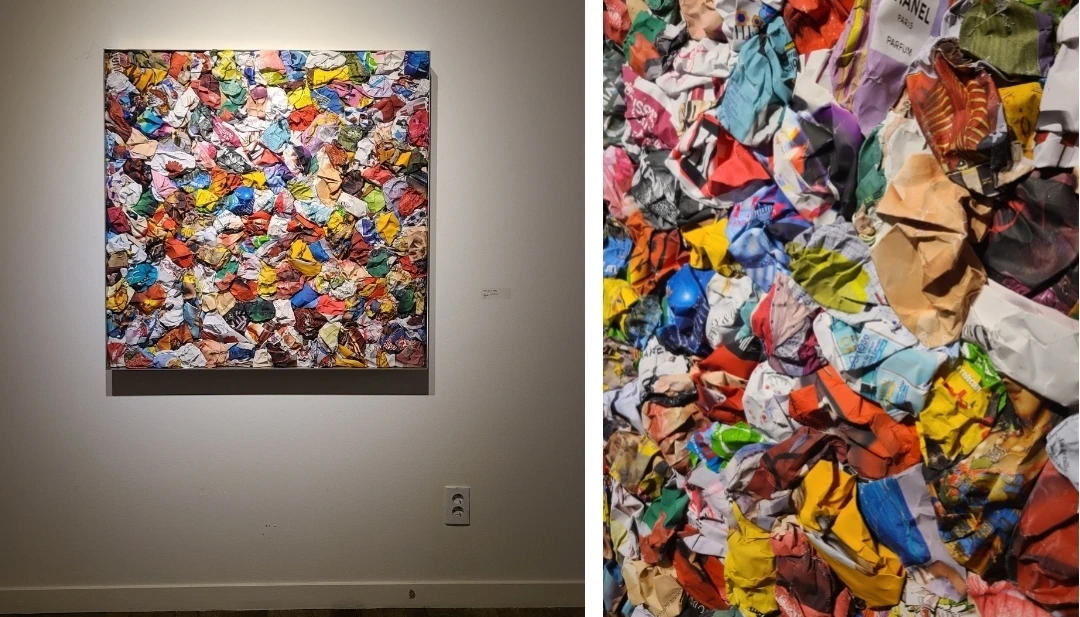 종이를 촘촘히 넣지 않고, 마치 풍선에 바람 빠진 듯 구겨서 작업을 했는데요. 이는 유행이 지닌 가벼움과 허무함을 보여주는 메시지입니다. 가장 비싼 브랜드의 로고와 이미지를 담고 있음에도 불구하고, 우리에게 보이는 건 무질서하게 쌓인 형형색색의 돌무더기나 폐기물처럼 보이죠. 유행의 화려함 겉모습과 그 뒤의 공허함이 대조되는 작품입니다.