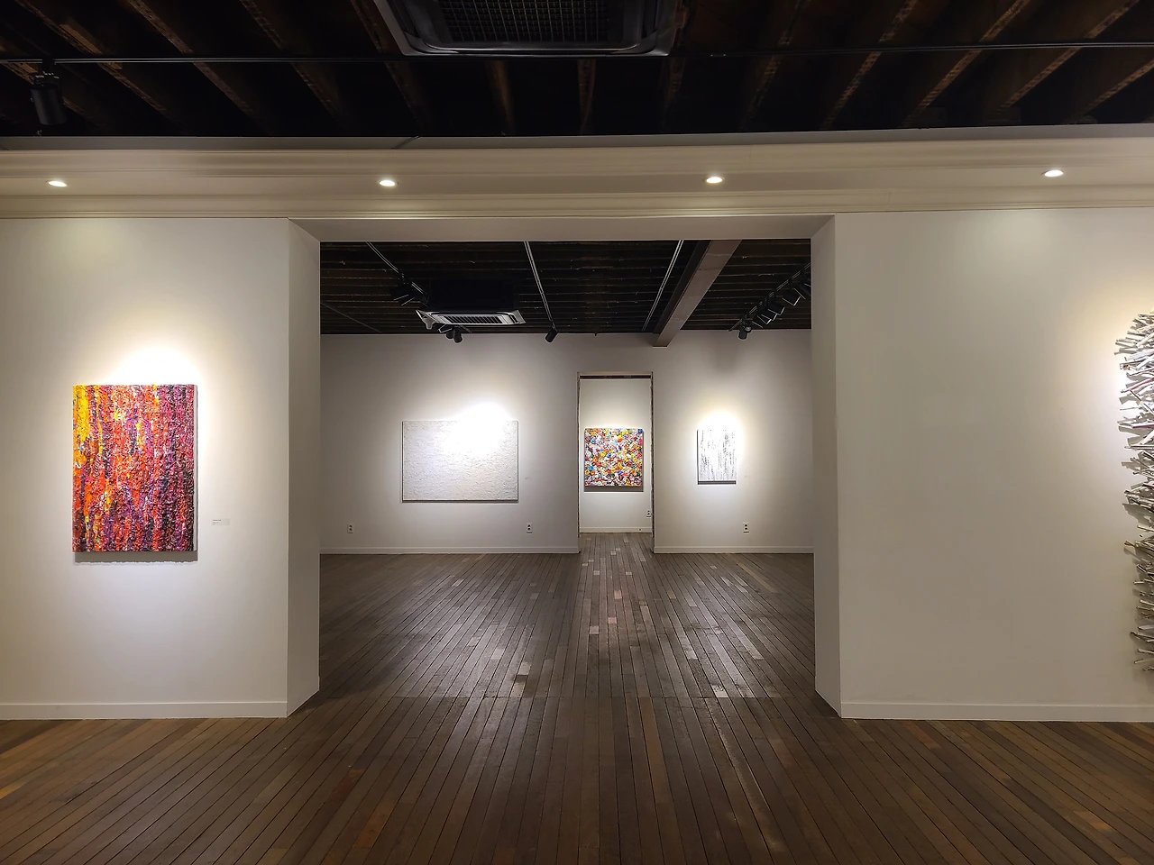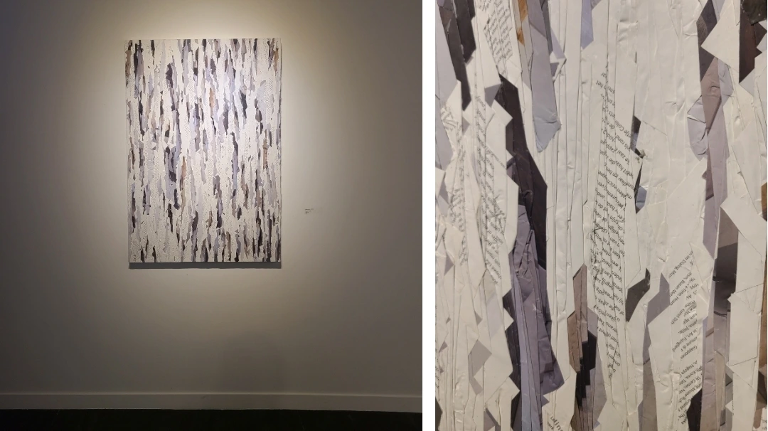 이번 개인전 전시서문의 글을 빌리자면, '끝없이 쏟아지는 이미지의 시대에 많은 정보의 소음 속에서 살아간다. 일상의 인쇄물들은 빠르게 소비되고 사라진다. 작가님은 버려진 파편들을 모아 붙이고, 구기고, 자르고, 쌓는다. 잔해들을 재조합하여 소음너머의 '침묵'을 시각화하는 행위이다. 작가님의 손끝에서 종이는 물감이 되고 절단은 붓질이 된다. 절단은 감춰진 내면의 결(undercurrent)을 드러내는 과정이다. 잘린 단면은 종이의 깊은 속살을 드러내고 그 안에는 시간의 주름과 기억의 지층이 겹겹이 쌓여있다. 표면 위에서 빛과 그림자는 부딪히고 사라지며, 반복된 손의 리듬 속에서 물질은 조용한 숨결을 얻는다.'
