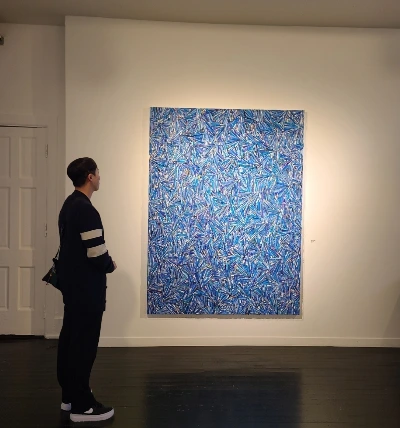 갤러리 초입 부분을 지나서 가장 먼저 보이는 작품은 바로 <Undercurrent 171001>입니다. 멀리서 보면 파란색 물감으로 그린 추상회화 같지만, 종이를 접어서 만들어낸 작품이죠. 접힌 종이들을 보면서 응축된 느낌을 받았는데요. 시끄러운 정보들의 소음들을 종이로 침묵시킨 듯 보였습니다. 그리고 수많은 종이 파편들이 캔버스 위에서 푸른색의 강력한 패턴으로 재조합되는 것을 볼 수 있는데요. 제 눈에는 화살표 패턴처럼 보였습니다. 역동성 있게 반복되는 패턴과 화살표의 엣지있는 모습이 작가의 의도와는 달리 미니멀리즘처럼 보이기도 했어요.