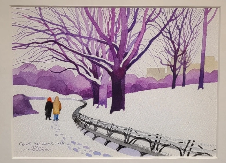 그러나 <Central Park> 작품을 보면, 그의 뉴욕 생활이 그렇게 순탄하지 않았다는 걸 알 수 있었습니다. 작품 속에 보이는 발자국은 그동안 걸어온 발자취를 표현했고, 옆에 함께 걷고 있는 사람은 그의 직업인 '미술'로 볼 수 있습니다. 뒤도 돌아보지 않고 걸어가는 모습은 특정 장소를 향하기보다는 기다리는 그 순간을 향해 나아가고 있는 모습을 보여줍니다. 특히 보라색으로 진하게 표현한 나무는 이국땅에서 나아가는 심명보 화백의 쓸쓸함과 고독함을 더욱 강조합니다.