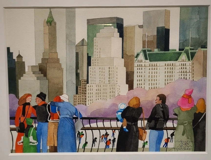 하지만 높은 건물들 위주로 그린 그림과 도심 속 아이스링크 주위에 오손도손 서 있는 사람들 위주로 그린 2개의 작품을 보면 각양각색의 사람들이 부대끼며 살아가는 도시는 혼란스럽지만, 그 안에서 사람들은 충분히 자유롭게 즐기며 살아갈 수 있음을 느낄 수 있게 그 당시 뉴욕 분위기와는 달리 수채화를 밝게 그렸습니다.