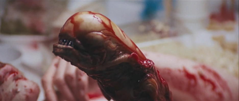 <에일리언 1> 크리처의 디자인은 굉장히 다채로운 형상을 띄고 있다. 이질적인 것들의 조합이라고 설명할 수 있을 것이다. 에일리언의 머리는 남근의 형태로 디자인되어있지만, 생명을 재생산할 수 있는 모체로 그려져 있다.[2] 그리고 에일리언의 입은 ‘이빨 달린 질(바기나 덴타타)’의 형태를 띠고 있다. 남성 괴물의 형체와 바기나 덴타타의 조합. 재미있지 않은가? 또한 에일리언이 성체가 되었을 때, 타액을 과다분비하여[3] ‘비체’ 이미지를 뿜어내는 것에도 주목할 필요가 있다. (‘비체’의 원지적 이미지는 에일리언 외에도 다양한 장면에서 등장한다.)