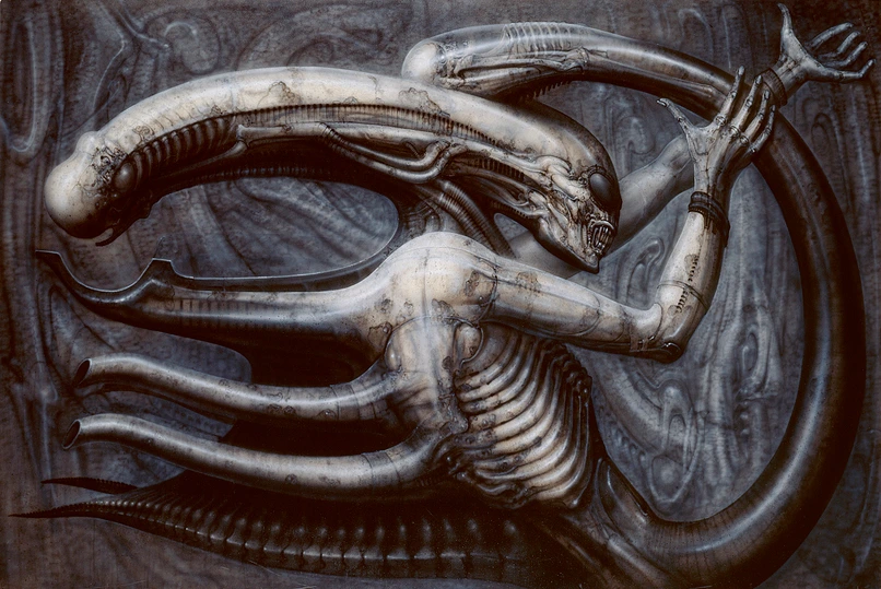 그리고 나는 <에일리언 1>이 이러한 비체적 이미지를 효과적으로 활용하고자 했다고 자신 있게 말할 수 있다. 그 이유는 <에일리언 1>의 크리처 디자이너 H.R 기거에 있다. 기거는 지그문트 프로이트의 무의식 개념을 바탕으로 신화적 상상력을 통해 SF 장르 영화에 영감을 제시하고 있다. 기거의 작품 세계를 살펴보면, 기거는 성과 신성성, 폭력을 통해 도덕적 금기의 시각적 해방을 꾀하고자 함을 알 수 있다. 그리고 이러한 금기의 시각적 해방은 사람들에게 불쾌감과 두려움을 선사했다. 여기에 추가로 주목할 점이 있다. 기거에게 여성이란 관심과 사랑의 대상인 동시에 두려움이자 불안의 대상으로 존재했다.[8] 여성을 알 수 없는 공포의 대상으로 보며, 이러한 공포심은 혐오와 증오의 파토스로 격하되어 유통된다. 또한 기거는 꿈과 무의식 같은 내면 심리에 관심이 많았으며, 신화나 오컬트적 소재를 차용하여 인간이 두려워하고 꺼리는 공포 대상을 탐구하였다. 자신의 꿈이나 망상으로부터 느낀 공포와 불안의 감정을 작품으로 승화하는 작업을 선호하였고, 이는 무기체와 유기체의 융합으로 표현하였다. 기거의 기계 물질 형태나 구조는 유기체와 무기체가 각각 독립적으로 존재하는 것이 아닌, 서로 떼어낼 수 없는, 융합된 형태로 구성되어 있다. 기거의 이러한 작품 세계를 보았을 때, 나는 지그문트 프로이트의 ‘움 하임리히’를 떠올렸다. 기거의 작품은 친숙한 것으로부터 억압되었다가 되돌아와 낯설게 만드는 언캐니를 불러일으킨다. 신체를 하나의 부속으로 전환하여 무차별적인 욕망과 폭력성을 표현하고, 본래의 형질을 잃어 다른 무엇인가로 대체되는 반복의 과정이다.[9]
