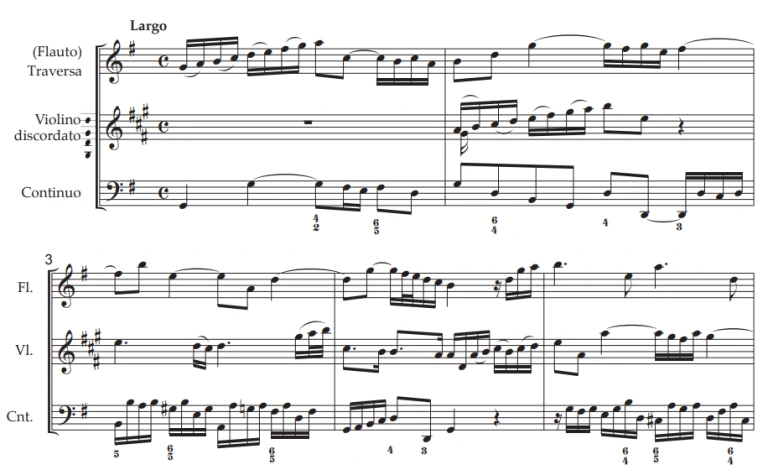 중세의 그레고리안 성가에서 시작되어 교회의 4 성부 음악을 거치며 바로크 음악은 자연스럽게 장단조 의 멜로디와 각기 다른 성부가 우선인 다성 음악을 대표하게 된다. 그래서인지 지금은 보통 트리오란 피아노, 바이올린, 첼로 또는 각각 다른 3 악기로 이루어져 있는 형태의 음악을 뜻하지만 바로크 시대의 트리오란 3가지의 악기를 위한 곡이 아닌 3가지의 성부를 가지고 있는 형태의 음악을 뜻하기도 한다. 위의 동영상에서 볼 수 있듯이, 오르간을 위한 트리오 소나타, 혹은 3가지의 성부를 연주할 수 있는 3가지의 악기와 그에 맞는 화음을 넣어 줄 수 있는 건반 악기. 총 4 악기를 위한 트리오 소나타 등이 바로크 시대에 흔히 사용되던 형태의 음악이다.