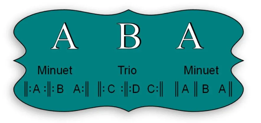 우리는 보통 실내악 곡의 빠른 악장에서 Trio라고 쓰여 있는 부분을 쉽게 살펴볼 수가 있는데 그렇다면 이 것은 무엇을 뜻하는 걸까. 보통 3악장의 Minuet이나 Scherzo는 중간 부분에 Trio라는 단독적인 부분을 가지고 있는데, 이는 사실 Minuet의 발전 과정에서 비교적 Minuett I 보다 가볍고 여린 음색을 가진 Minuet II 가 Trio라는 명칭으로 변화된 것이다. Minuet의 Trio라고 불리기도 하는 이 Trio는 위의 내용과 비슷하게, 온 악기가 연주를 하는 Minuet I에서 소리를 줄여 세 개의 악기로 여리게 연주를 하라는 일종의 지시인데, 현대에서는 3 악기로 연주를 하기보다는 음량을 줄이고 음색을 달리하여 표현하는 방식의 관용적인 표현으로 사용된다. (3/4의 음악이기에 Trio가 아니다 이겁니다..) 이는 Morzart, Beethoven, Haendel 등 여러 작곡가의 소나타나 콰르텟, 교향곡 등에서 쉽게 찾아볼 수 있다.