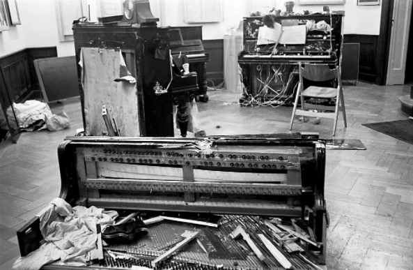 윤이상에게 했던 말대로 백남준은 독일 부퍼탈의 갤러리 파르나스에서 열린 백남준의 첫 번째 개인전 《음악의 전시 —전자 텔레비전》에서 <총체 피아노>를 전시하는데, 이 작품은 원래 관람객이 그 위에 올라가서 걷거나 뛰면서 발로 연주할 수 있도록 의도되었으나, 전시 개막일에 커다란 도끼를 들고 나타난 요셉 보이스가 홀에 들어와 눕혀 놓은 이 피아노에 온 힘을 다해 도끼를 휘둘러 피아노를 산산조각 내고 말았다고 한다. 백남준뿐만 아니라 현장에 있는 누구도 미리 알지 못했던 해프닝이었지만 이 즉흥극이 끝나자 현장에서는 우레와 같은 박수갈채가 터져 나왔고, 전시 공간과 작품들을 관리 중이던 몬트베는 상황을 수습하기 위해 양동이의 물을 보이스에게 끼얹었다고. 이 피아노는 전시 기간 동안 부서진 상태 그대로 방치되었고 관람객들은 이 의도적으로 부서지고 방치된 피아노를 구경하고 밟고 지나가기도 했다.