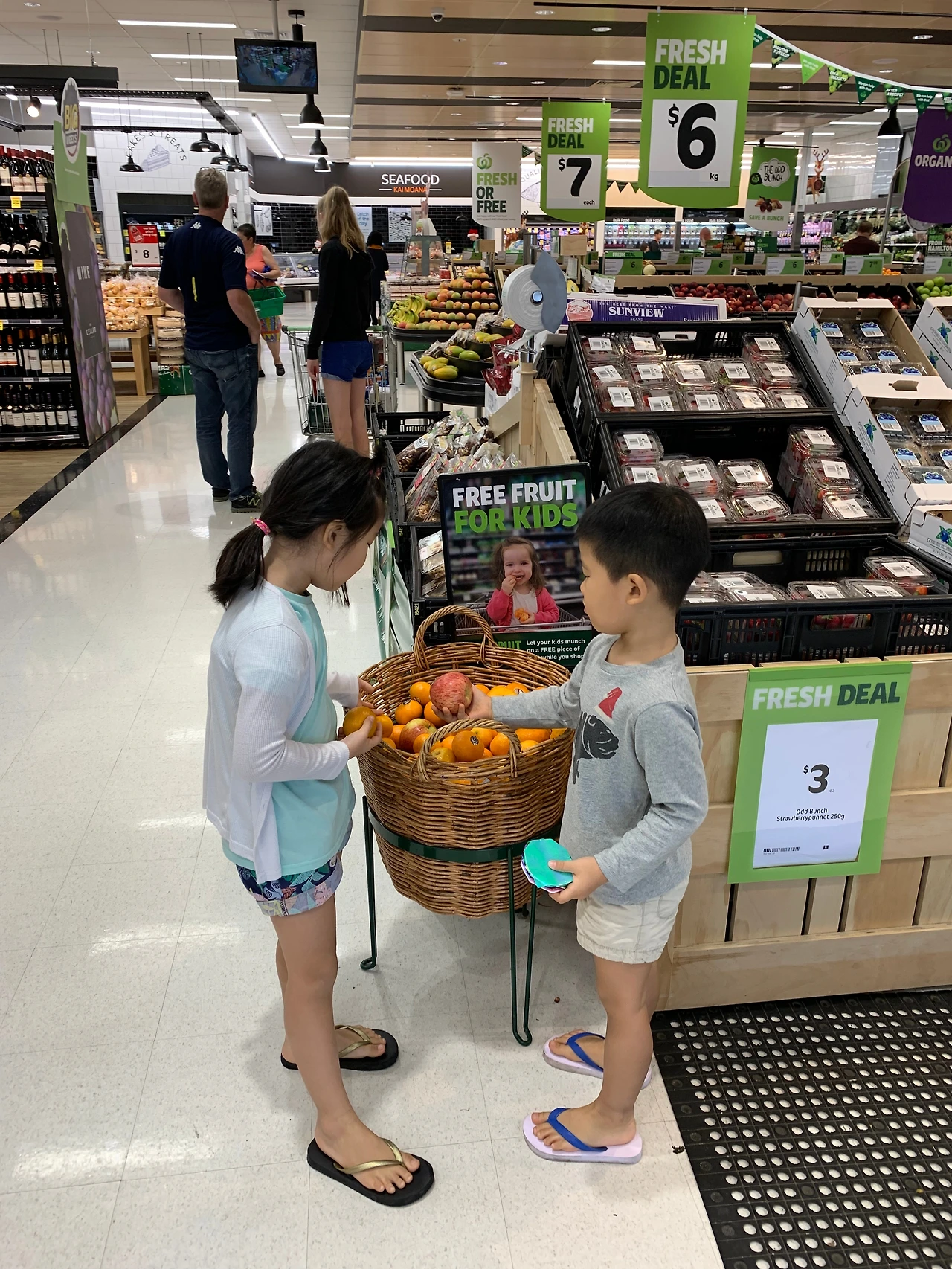 아이들이 자유롭게 먹을 수 있도록 입구에 과일바구니를 놓아둔 마트인데 매일 신선한 제철 과일들을 준비해 아이들을 기쁘게 한다. 사실 아이들이 과일을 먹는 잠깐의 순간이나마 조용히 해준다면 나는 좀 더 집중해서 빠르게 장을 볼 수 있고 나 혼자 아이 둘을 데리고 다니며 장을 보는 스트레스의 수치가 놀랍도록 낮아지니 충성 고객이 될 수밖에.
