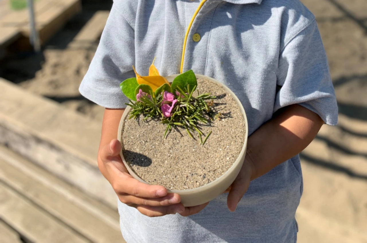 마침 첫째가 모래놀이장에서 일회용 그릇에 모래를 담고 그 위를 꽃으로 장식해 케이크이라고 나에게 보여주러 왔다.