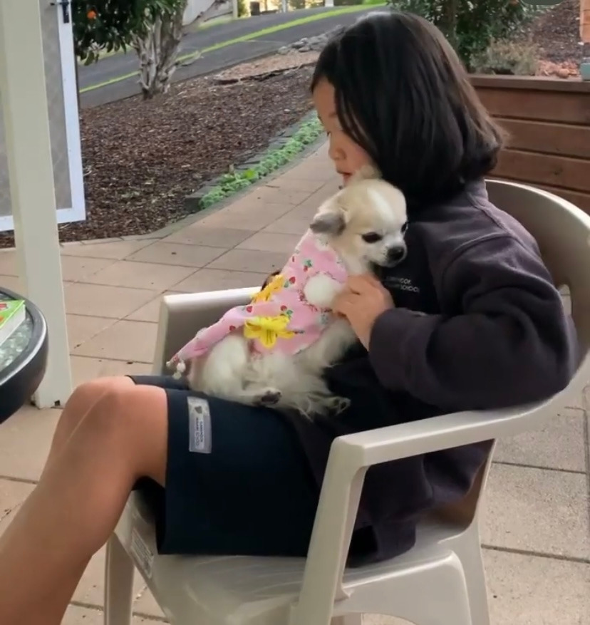 (좌) 옆집 치와와의 옷을 만들어 입혀보는 첫째. 치수를 어떻게 잰건지 신기하게 딱 잘 맞는다 (우)매일 만나는 저먼 셰퍼트 두마리에게 직접 만든 반다나를 선물하는 남매