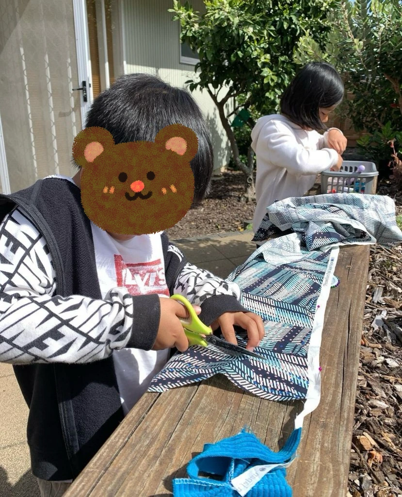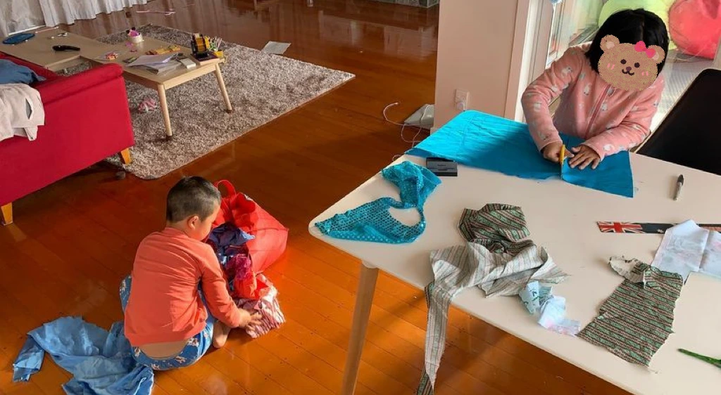 동네 강아지 고양이의 반다나(스카프)를 만들어주기 위해 집 안과 밖에서 천을 자르고 바느질 하는 남매