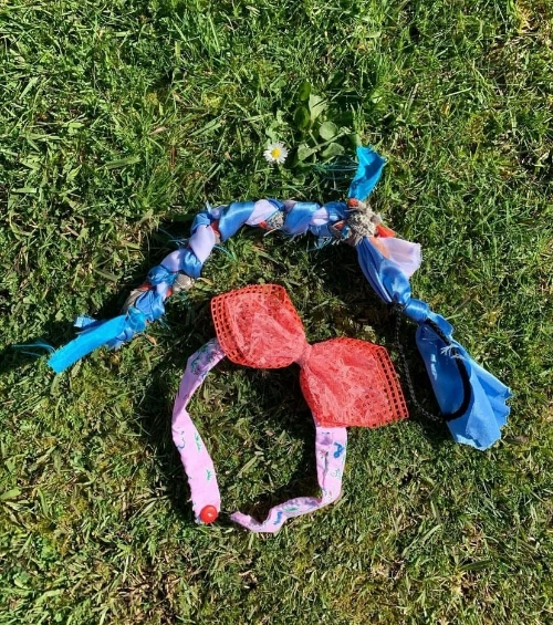 (좌) 완성된 강아지 반다나, 끝에 단추를 달아 강아지 목에 걸 수 있게 디자인했다. (우) 동네 고양이와 노는 첫째
