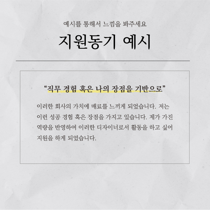 [이러한 회사의 가치에 매료를 느꼈습니다. 저는 이런 성공 경험을 가지고 있고 이런 디자인 습관을 가지고 있습니다. 제가 가진 역량을 반영하여 이러한 디자이너로서 활동하고 싶어서 지원을 하게 되었습니다.]라는 문장을 넣는 것이 좋습니다.
