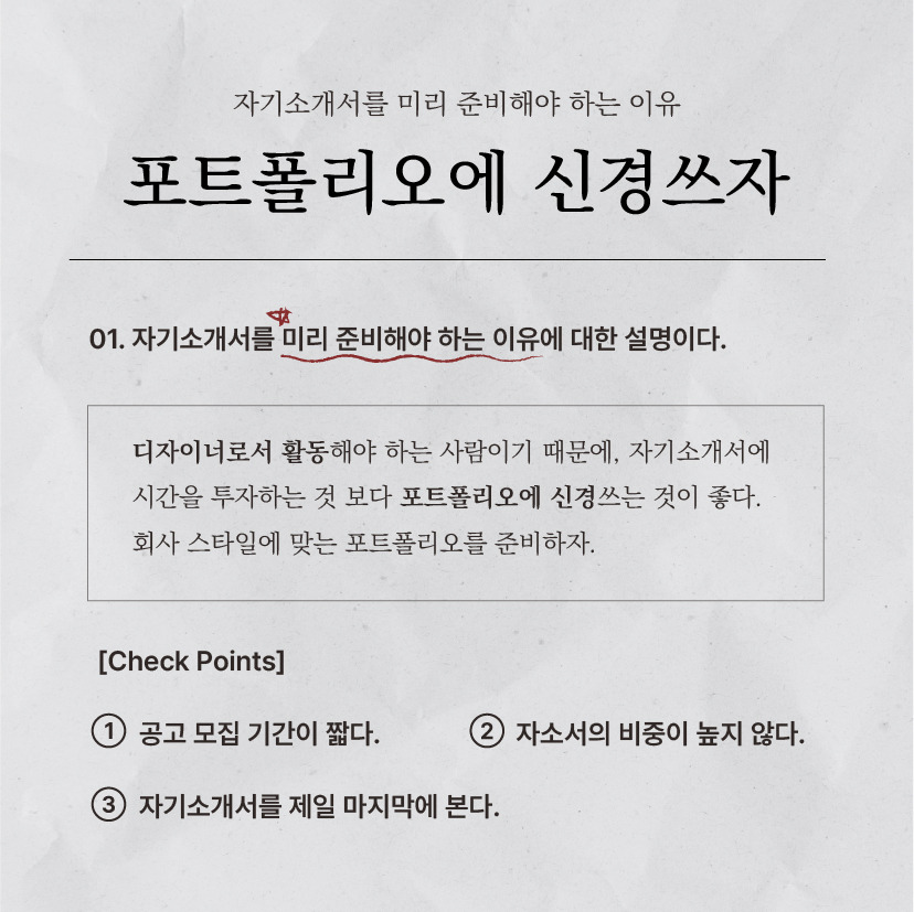 디자인 회사에 들어가기 위해서는 포트폴리오, 이력서, 자기소개서를 준비해야 합니다. 하지만, 아무튼 간에 우리는 디자이너로서 활동해야 하는 사람으로 자기소개서에 시간적 비중을 할애하는 것보다 회사 스타일에 맞도록 폼을 맞추어 포트폴리오를 제출하는 것이 더 중요합니다.