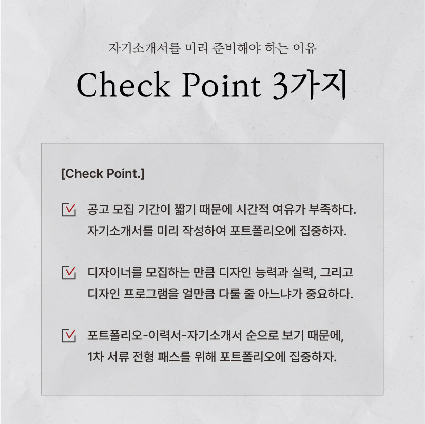 - 자기소개서, 이력서, 포트폴리오 3가지를 동시에 제출하기 때문에, 한꺼번에 준비하는 것보다 자기소개서를 미리 준비를 해 놓은 후, 포트폴리오에 시간적 비중을 투자하여 제출하는 것이 좋습니다