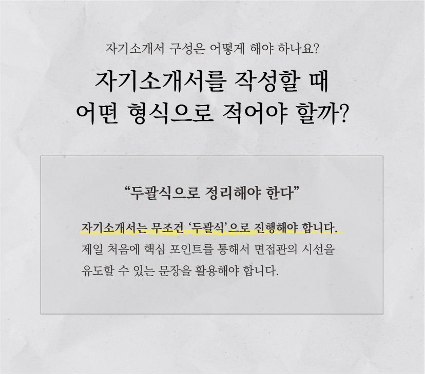 보통 자기소개서는 무조건 '두괄식'으로 진행해야 합니다. 제일 처음에 핵심 포인트를 면접관에게 전달함으로서 시선을 끌 수 있기 때문에, 임팩트 있고 후킹있는 문장을 활용하여 시선을 사로잡아야 합니다.