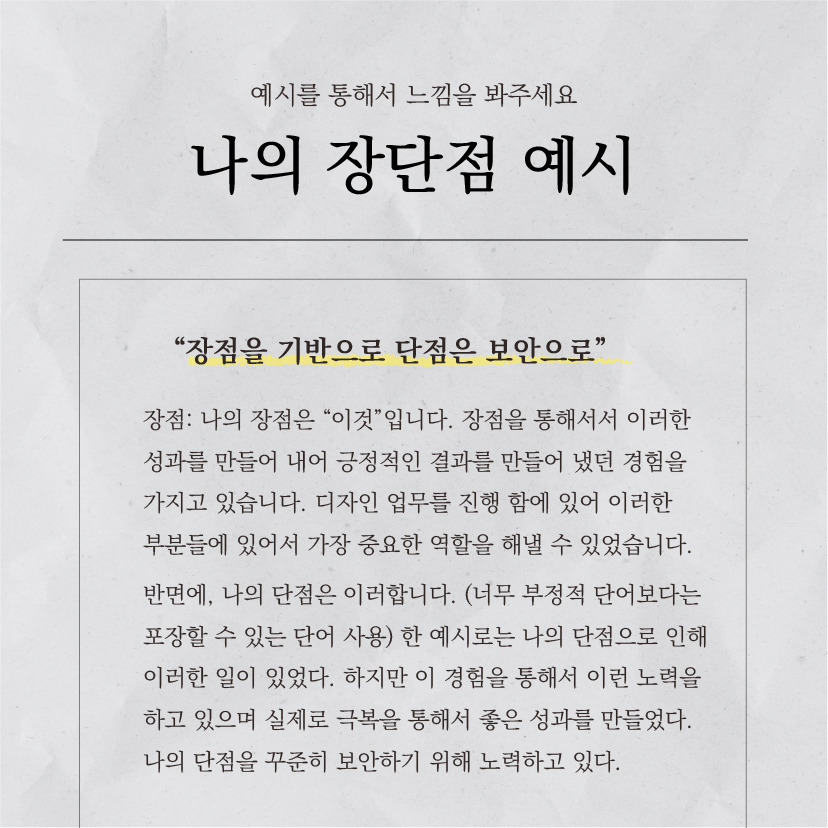 장점: 나의 장점은 “이것”입니다. 나의 장점이라고 말할 수 있는 있는 이유는 이러한 성과를 만들어 내어 긍정적인 결과를 만들어낸 경험을 가지고 있습니다. 나의 장점은 디자인 업무를 진행 함에 있어 이러이러한 부분들에 있어서 가장 중요한 역할을 해낼 수가 있기 때문에 장점이라고 볼 수 있습니다.
