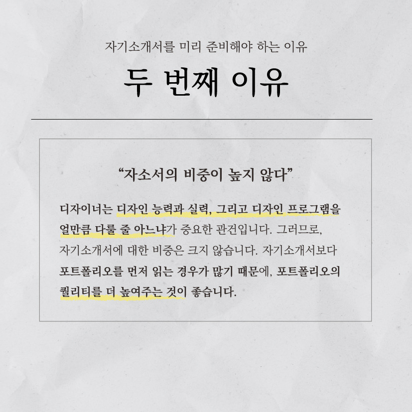 디자이너는 디자인 능력과 실력, 그리고 디자인 프로그램을 얼마큼 다룰 줄 아느냐가 더 중요한 관건 중 하나입니다. 그렇기 때문에, 자기소개서를 먼저 읽는 것보다 미리 이미지로 한 번에 훑어볼 수 있는 포트폴리오를 1차적으로 읽는 경우가 많습니다. 아무리 자기소개서의 내용이 좋더라도 포트폴리오의 퀄리티가 현저히 낮으면 탈락이 되어 자기소개서는 읽지 않고 폐기 처분이 되는 것이나 다름이 없습니다. 자기소개서에 대한 시간적 비중을 높이는 것보다 포트폴리오의 퀄리티를 높여주는 것이 좋습니다.