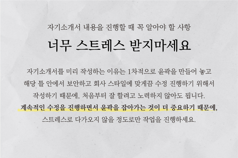 자기소개서 내용 구성은 저도 많이 어렵게 느껴지는 부분입니다. 너무 스트레스받지 마세요. 자기소개서를 미리 준비하는 이유는 1차적인 윤곽(틀)을 잡기 위함입니다. 지원하는 회사 스타일에 맞게 다시 수정해야 하기 때문에 처음부터 잘하려고 노력할 필요가 없습니다. 계속적인 수정을 진행하면서 윤곽을 만들어 나가는 것이 더 중요합니다. 저도 처음에 자기소개서를 작성할 때는 엄청 길고 무슨 이야기를 하는지 모를 정도였지만, 지속적인 디벨롭을 통해서 적다보니, 현재는 윤곽을 잡아 놓은 상태입니다. 꼭 디벨롭해야 겠어! 보다는 회사 스타일에 맞게 자기소개서를 조금씩 수정하다보면 저절로 윤곽이 잡히게 되니 조급해 할 필요가 없습니다.
