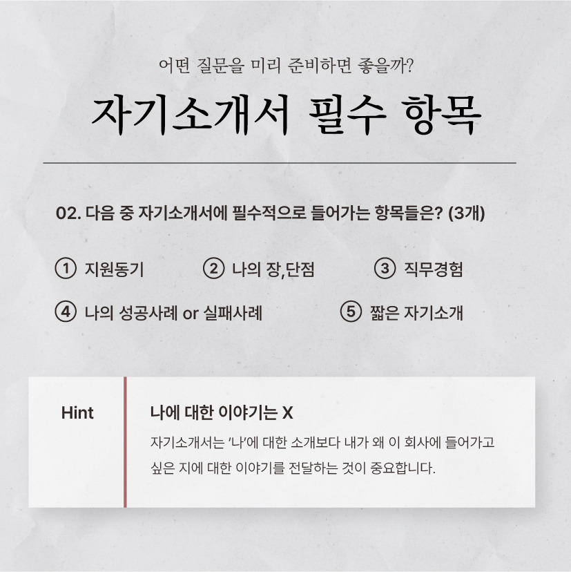 자기소개서에 들어가야 할 항목은 크게 4가지로 나눠집니다. 지원동기, 나의 장단점, 직무 경험, 성공사레 or 실패사례로 볼 수가 있습니다. 대기업/중소기업/스타트업 어느 회사에 들어가든 간에 위 4가지는 필수적으로 준비하는 것이 좋습니다. 추후 면접 준비를 할 때도 굉장히 큰 도움이 될 수 있기 때문에, 내가 어떤 내용을 담아서 이야기를 하고 싶은 지 키워드를 뽑은 후 적어내면 좋습니다.