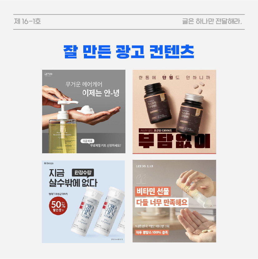 훨씬 간결하고 훨씬 눈에 잘 들어와서 시선이 갈 수 밖에 없는 광고 컨텐츠입니다. 제품과 문구가 잘 보여지고 시선 처리가 효과적인 광고 컨텐츠입니다.