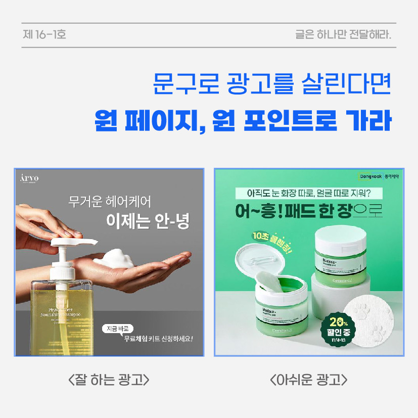 앞서 두 번째 설명글과 맞물리는 이야기입니다. 하지만 여기서 가장 중요한 것은 원 페이지, 원 포인트를 설정해야 합니다. 글이 너무 긴 경우(문장과 단어가) 읽히지 않을뿐더러, 어떤 제품을 홍보하고자 하는지 요점부터 파악하기가 어렵습니다. 이는 광고를 보고 제품을 사고자 하는 욕구가 사라지게 됩니다.