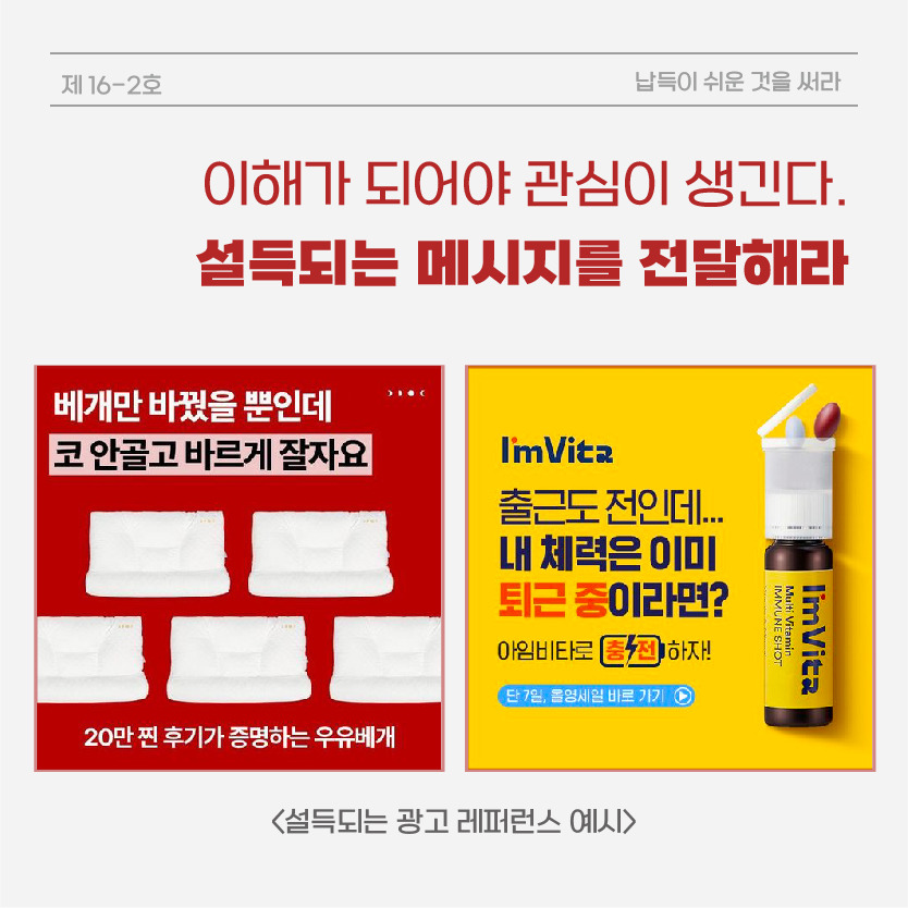 광고 컨텐츠를 제작할 때, 소비자가 왜 이 제품을 사야만 하는 지를 설득할 수 있는 문구를 정해서 전달하는 것도 하나의 방법입니다.