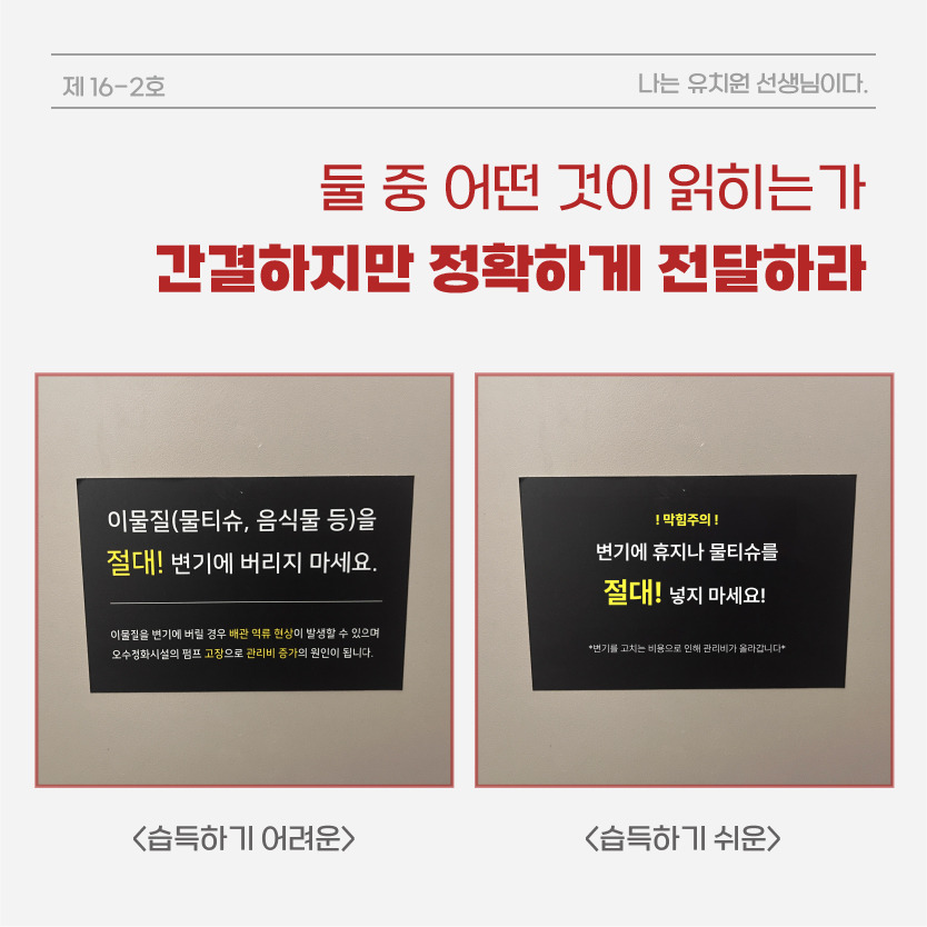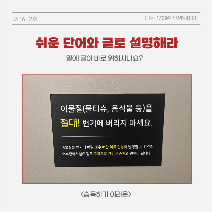 해당 글을 읽고 바로 이해가 되셨을까요? 글을 봤을 때는 변기에 이물질을 버리지 말라달라는 경고문구입니다. 하지만, 어려운 단어 사용과 문자 때문에 그런 지 두 번은 읽어야지만 이해가 되는 문구로 해석이 됩니다.