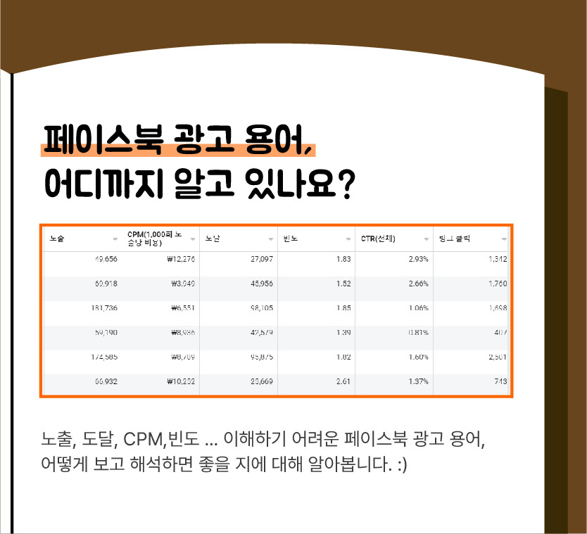 노출, 도달, CPM, 빈도... 등 이해하기 어려운 것들 투성인 페이스북 광고 용어, 앞으로 광고를 분석할 때 어떻게 보고 해석해야 하는지 함께 알아봅니다.