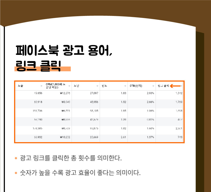 "해당 광고를 클릭한 사람의 수"를 의미합니다. 링크 클릭수 또한, CTR처럼 숫자가 높을수록 광고 효율이 좋다는 의미를 가지고 있습니다.