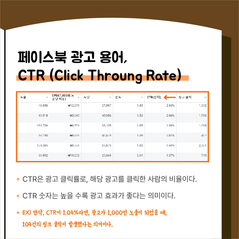 "CTR은 광고 클릭률로, 광고를 보고 관심이 생겨 해당 광고를 클릭한 사람의 비율"을 의미합니다. 만약, CTR이 1.04%라면 광고가 1,000번 노출이 되었을 때 104건의 링크 클릭이 발생이 되었다는 의미이며, CTR의 숫자는 높을수록 광고 효율이 매우 좋다는 의미를 가지고 있습니다.
