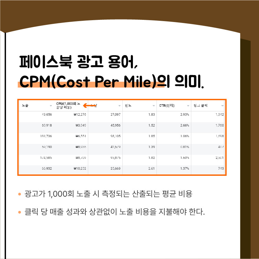 "CPM은 광고가 1,000회 노출이 되었을 때 산출되는 평균 비용"을 의미합니다. CPC와 다르게 CPM은 광고가 노출이 되었을 때 측정이 되는 비용으로 해당 광고를 이용하여 사이트를 클릭했는지 안 했는지 확인이 불가능합니다. 또한, 성과와 상관없이 해당 캠페인 노출에 대한 비용을 지불해야 합니다.