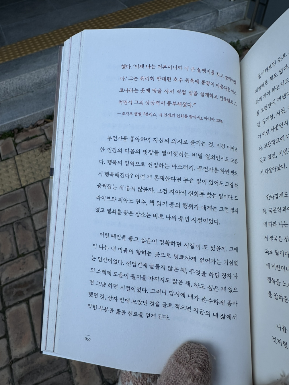 글을 쓸 때 우리는 스스로에 관해 생각하고 깊이 고뇌하기에 인간다운 존재로 거듭나는 거라고. 햄릿도, 로미오도, 베르테르도 고뇌했다. 사는 것은 늘 선택의 문제이고, 우리는 선택지를 품고서 문학 속의 그들처럼 주저하고 또한 후회한다. 그것은 결함이 아니라 차라리 인간다움이다. (…) 외부적으로 문제가 생기거나 내면에 균열과 갈등이 생겼을 때, 누군가에게 조언을 구하고 답을 묻는 대신 혼자 그것에 관해 쓰는 스스로 답을 찾아내겠다는 의지다. 그것이 사람을 성숙하게 한다.