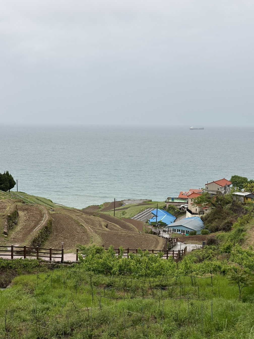 장거리 운전을 한 두 남자를 위해 잠시 휴식하다가 멀지 않은 곳에 있는 다랭이마을을 보고 오기로 길을 나섰다. 마침 비가 폭우 수준에서 좀 사그라들어 우산 쓰고 걸을 정도가 되었다. 다랭이마을은 남해 특유의 계단식 논을 경작하는 농작마을이다. 비가 와도 돌아다니려고 우비와 장화를 챙겨 왔는데 정말 잘한 선택이었다. 가파른 골목길을 걸어 내려가는 동안 비 오는 바다와 여러 농작물들이 심긴 논밭들이 펼쳐진 광경을 바라봤다. 구름 낀 하늘과 높아진 바다가 운치 있었다.