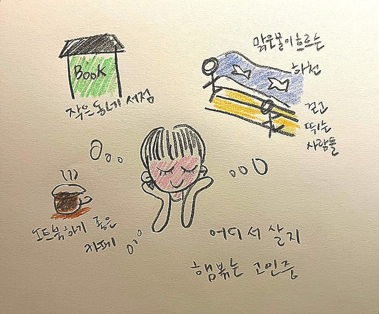 "음... 난 오래된 곳이 좋아. 을지로? 대학로? 서촌 좋아! 자유로운 분위기였으면 좋겠는데 그렇다고 지나치게 힙한 공간은 부담스러워. 아... 한강도 싫어. 물이랑 안 맞아. (어차피 비싸서 살 지도 못하지만) 그렇지만 동네에 하천이 있었으면 좋겠어!"