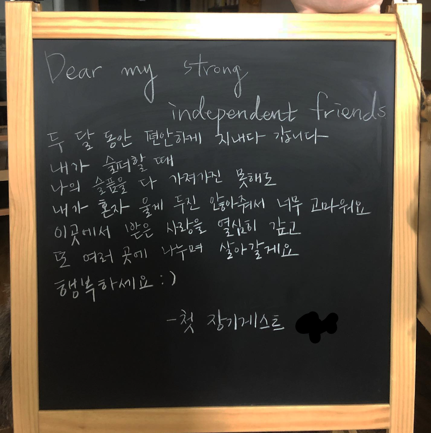 그러던 어느 날, 우리의 첫 나그네가 표정이 좋지 않은 채로 귀가했습니다. 그녀는 누군가와 다툰 뒤 마음이 크게 실족한 상황이었는데, 방 안에 틀어 박혀 밖으로 나오지도 않고 울고만 있길래, 밥 먹을래?라고 물었지만 답을 얻을 수 없었습니다. 슬플 때 밥도 안 챙겨 먹으면 더 슬퍼지는 나는 그녀의 슬픔을 위로해 줄 방법이 없어서 발을 동동 구르고 말았지요.