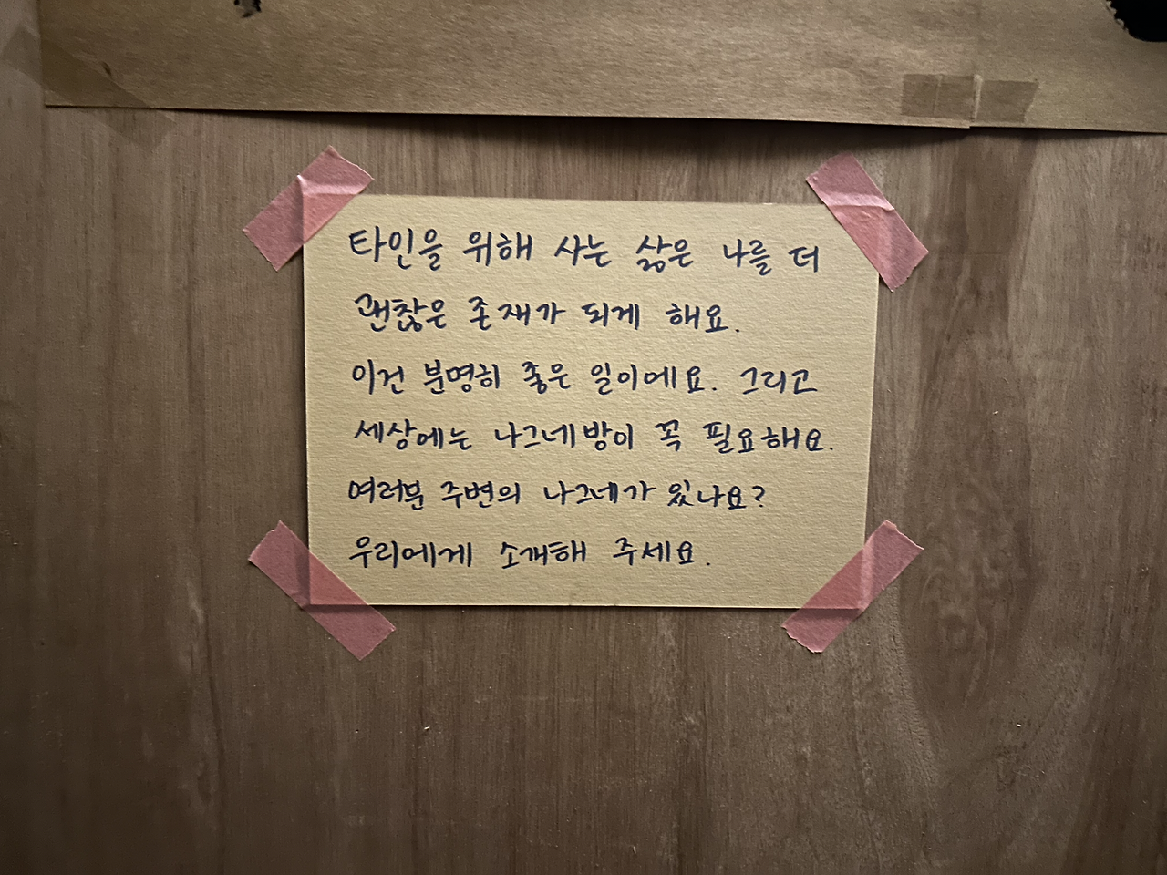 앞선 질문에서 나그네방을 운영하는 일이 저에게 전혀 손해가 아니라고 이야기했습니다. 오히려 인풋 대비 좋은 아웃풋이라고 오버까지 했죠. 그렇게 말할 수 있는 건 나그네방은 세상이 발견하지 못한 보물이라는 생각이 제 안에 있기 때문입니다. 나그네방은 행복을 내 집안으로 들이는 손쉬운 방법입니다. 모두가 찾아 헤매지만 찾지 못하는 행복의 열쇠를 저는 우연히 발견하게 되었죠.